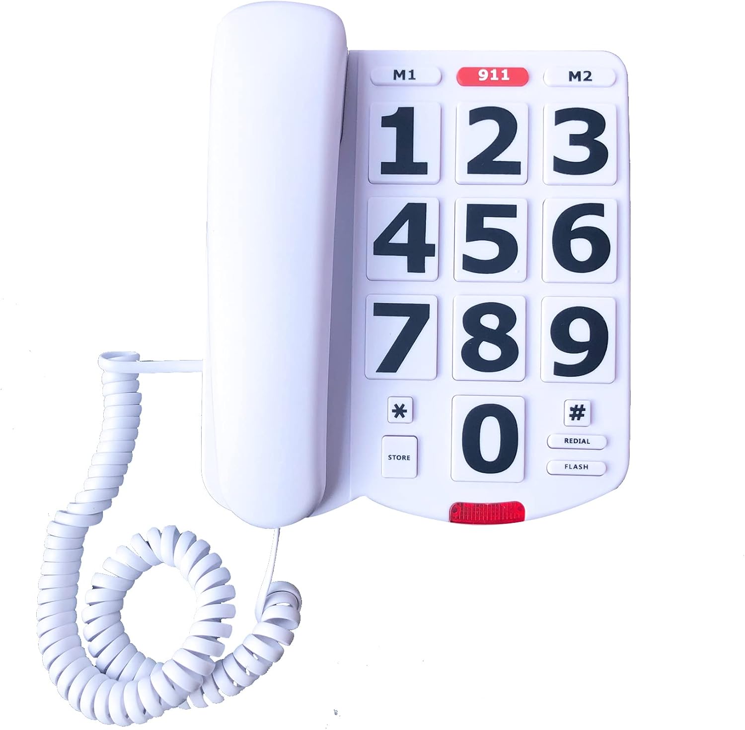 Senior-Friendly Landline Phone – Designed for easy use, this phone features large buttons and an extra-loud ringer, making it a perfect gift for grandparents. Simple to operate, it works instantly by plugging in the included cord (requires an active landline service). A red emergency button allows one-touch dialing to 911, while two memory buttons (M1 & M2) enable quick access to important contacts. The adjustable loud ringer and three-level handset volume control ensure clear hearing for seniors.