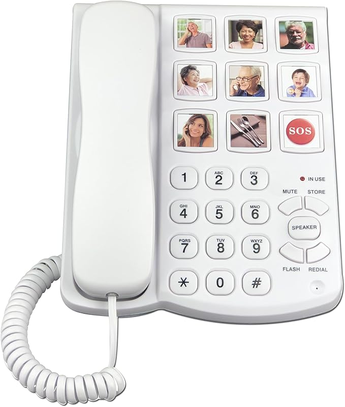 Easy-to-Use Big Button Phone – Designed for visually impaired seniors, this Benotek landline phone features large buttons for effortless dialing. The 9 picture memory buttons allow quick speed dialing by assigning contacts to replaceable photo keys. A red SOS button provides instant emergency calling. Equipped with hands-free speakerphone, flash, mute, redial, and volume controls, it ensures clear, loud conversations. No batteries required, as it runs on a standard RJ11 telephone line. Built with durable, high-quality plastic, it offers long-lasting reliability with a free replacement guarantee.